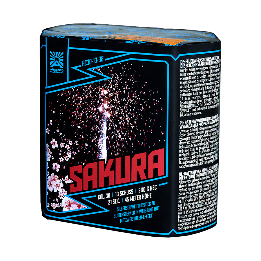 13 Schuss Batterie von Argento Feuerwerk mit einem neuartigen Effekt. Jeder Schuss gibt zeitversetzt weiße und rote Blütensterne (Red plum effect) frei. Eine wunderschöne Kombination.