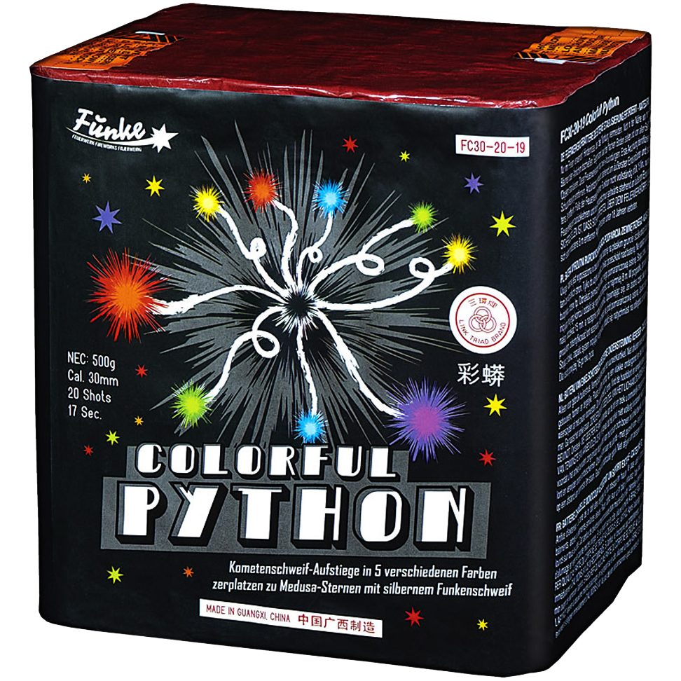 Colorful Python aus dem Hause Funke ist eine weitere Feuerwerksbatterie mit Medusasternen, dieses mal als bunte Kombination. Kometenschweif-Aufstiege in 5 verschiedenen Farben zerplatzen zu Medusa-Sternen mit silbernem Funkenschweif