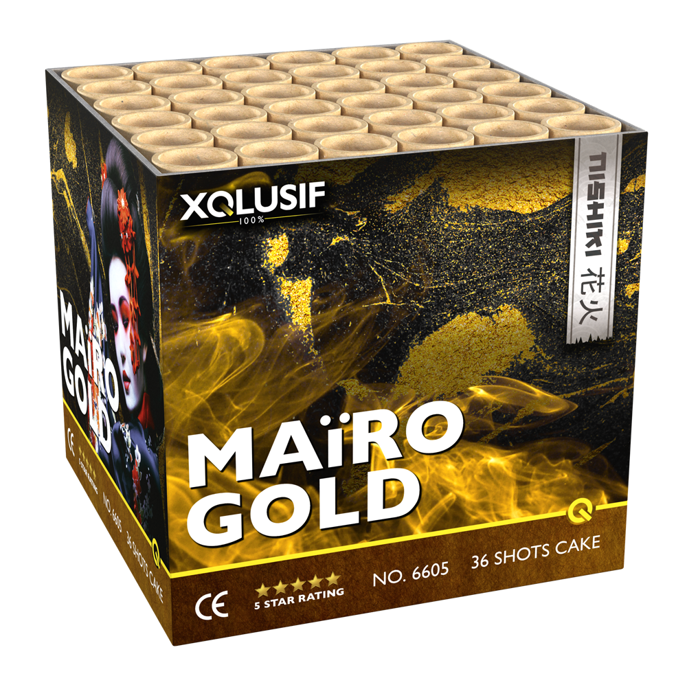 Die 36 Schuss Batterie Maïro Gold aus der Lesli XQLUSIF 100% Serie.Dank modernster Herstellung und der Verwendung hochwertiger Rohstoffe, bietet die Maïro Gold beeindruckende Effekte mit tiefgoldenen Bouquets und speziellen Nishiki Effekten.