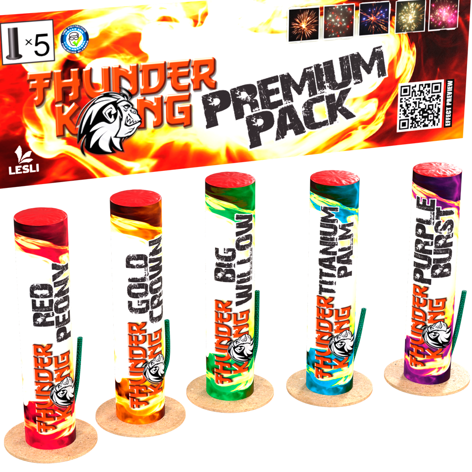 Thunder Kong Premium Pack - 5er Päckchen. Fünf heftige Bombenrohre mit kräftigen Zerlegern und verschiedenen Effektkombinatioonen. Kaliber 25mm