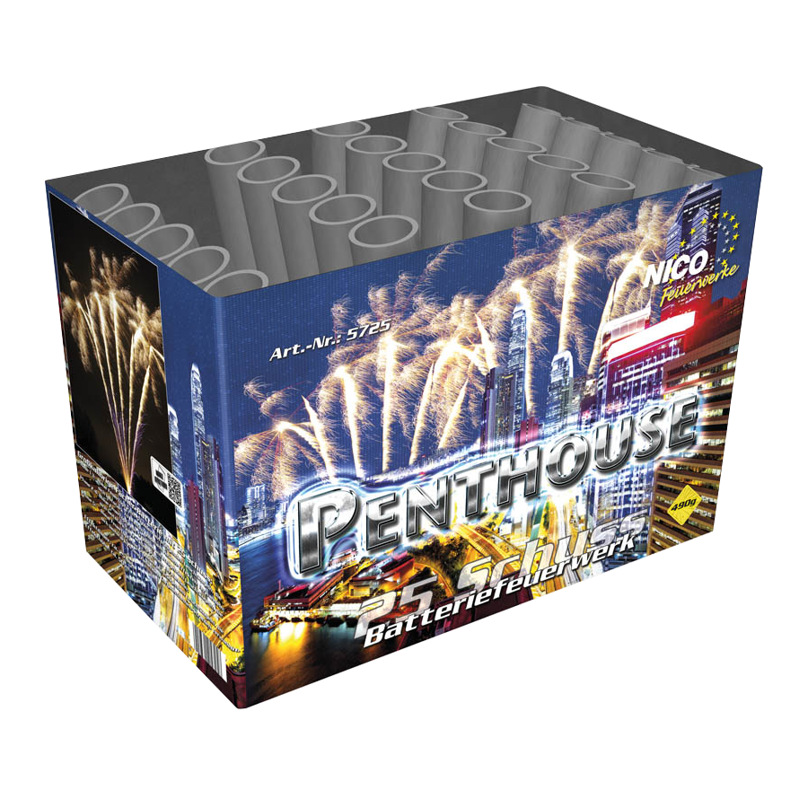 Feuerwerksbatterie von Nico Feuerwerk. Fächer-Feuerwerksbatterie mit 25 Schuss, jeweils in 5er-Salven (fan-shape) abgefeuert: