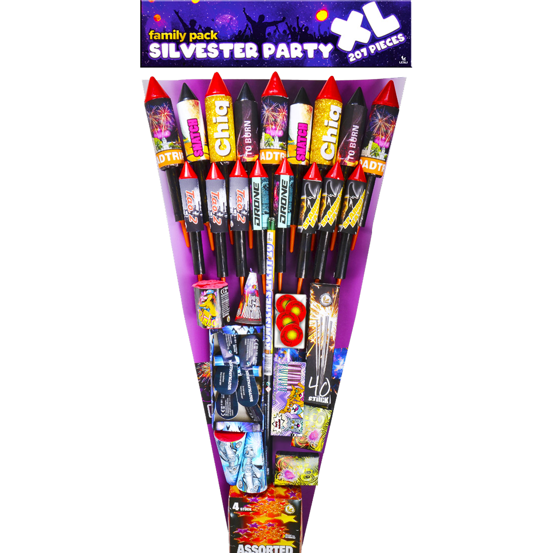 Silvester Party XL von Lesli Fireworks. Das XXL Familiensortiment für gehobene Ansprüche. Alles drin was das Herz begehrt. Große Raketen mit Bombeneffekt. Sprüh und Leuchtartikel sowie Römische Lichter und Böller.