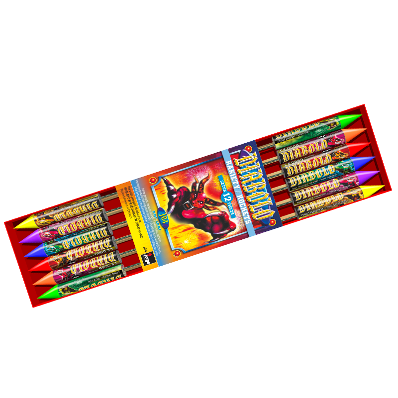 12 Raketen zweifach sortiert: rote Sterne, grüne Sterne, bunte Sterne, silber Fische, crackling Sterne und weiße Blinker.